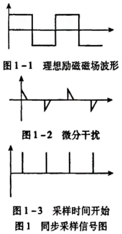 在現行的電磁流量計設計中,低頻矩形波勵磁結合了直流勵磁和交流勵磁的優點,成為主要勵磁方式之一。在低頻勵磁方式下其干擾主要表現為:由勵磁電流突變產生的微分干擾信號。理想勵磁磁場信號如圖1-1所示,為低頻矩形波,實際上隨著勵磁電流變化(dI/dt)磁場上產生微分干擾信號,如圖1-2,可以看到隨著電流的穩定,干擾信號隨之消失,因此同步采樣技術可以有效抑止微分干擾信號。實際設計中模數轉化器使用AD公司的24位sigma delta模數轉化器AD7714。AD7714可以分別采用硬件和軟件方式進行采樣開始時間控制從而實現同步采樣。采用軟件方式時,當控制寄存器中FSYNC位為邏輯1時,模數轉換器處于復位狀態;向該位寫邏輯0時,器件開始采樣輸入信號。在應用中,低頻勵磁信號由MSP430單片機內部定時器產生,同時產生采樣信號。如圖1所示,采樣開始時間滯后勵磁信號1/4個周期。