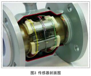 其中B、D、S為常量,流量與感應(yīng)電動(dòng)勢(shì)U成正比關(guān)系,因此,測(cè)得感應(yīng)電動(dòng)勢(shì)U,即可得到流體流量。由此可見,電磁流量計(jì)正常運(yùn)行需要有穩(wěn)定的磁場(chǎng),而磁場(chǎng)正是靠傳感器線圈內(nèi)的勵(lì)磁電流來(lái)產(chǎn)生的。勵(lì)磁線圈如圖2所示。對(duì)線圈對(duì)稱安裝在傳感器正對(duì)的兩側(cè),以產(chǎn)生均勻的磁場(chǎng),傳感器剖面圖如圖3所示