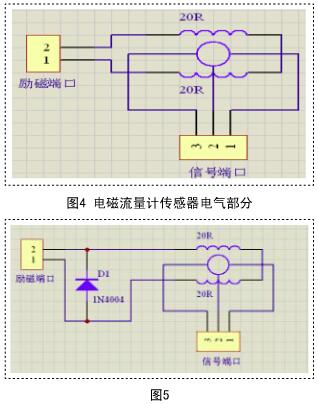 電磁流量計(jì)傳感器勵(lì)磁電流是產(chǎn)生電火花的危險(xiǎn)源,電磁流量計(jì)要用于井下,首先得勵(lì)磁電路達(dá)到本質(zhì)安全要求。電磁流量計(jì)傳感器電氣部分由2個(gè)線圈組成,如圖4。