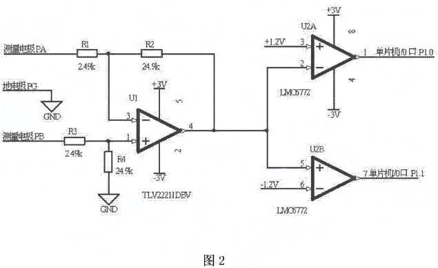 如圖1所示,應用于電磁流量計極化電壓檢測的電路,測量電極PA與電阻R1的端連接,電阻R1的另一端與電阻R2的一端、運算放大器U1的反相輸入端3腳連接,電阻R2的另一端與運算放大器U1的輸出端4腳、雙路比較器通道一U2A的反相輸入端2腳、雙路比較器通道二U2B的同相輸入端5腳連接,測量電極PB與電阻R3的一端連接,電阻R3的另一端與電阻R4的一端、運算放大器U1的同相輸入端1腳連接,電阻R4的另一端與地連接,地電極PG與地連接,運算放大器U1的電源供電端5腳與正電源VAcc連接,運算放大器U1的接地端2腳與負電源WAss連接,雙路比較器通道一U2A的同相輸入端3腳與+1.2V連接,雙路比較器U2A的電源供電端8腳與正電源VAcc連接,雙路比較器U2A的接地端4腳與負電源wAss連接,雙路比較器通道一U2A的輸出端1腳與單片機的I/O口P1.0連接,雙路比較器通道二U2B的反相輸入端6腳與-1.2V連接,雙路比較器通道二U2B的輸出端7腳與單片機的I/O口P1.1連接如圖2所示,測量電極PA與電阻Rl的一端連接,電阻R1的另一端與電阻R2的端、運算放大器U1的反相輸入端3腳連接,電阻R2的另一端與運算放大器U1的輸出端4腳、雙路比較器通道一U2A的反相輸入端2腳、雙路比較器通道二U2B的同相輸入端5腳連接,測量電極PB與電阻R3的一端連接,電阻R3的另一端與電阻R4的一端、運算放大器UI的同相輸入端1腳連接,電阻R4的另一端與地連接,地電極PG與地連接,運算放大器U的電源供電端5腳與正電源+3連接,運算放大器UI的接地端2腳與負電源-3V連接,雙路比較器通道一U2A的同相輸入端3腳與+1.2V連接,雙路比較器U2A的電源供電端8腳與正電源+3V連接,雙路比較器U2A的接地端4腳與負電源-3V連接,雙路比較器通道U2A的輸出端1腳與單片機的I0口P1.0連接,雙路比較器通道二U2B的反相輸入端6腳與-1.V連接,雙路比較器通道二U2B的輸出端7腳與單片機的I/0口P1.1連接。