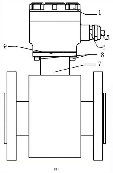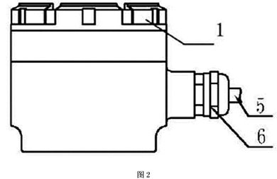 本實施例如圖4所示,分體接線盒用4只M6的螺釘8將殼體3與固定在流量傳感器7上端,殼體3與傳感器7之間采用橡膠密封墊9密封。端子排7用兩個M4的螺釘固定在殼體內,接線端子通過連接電纜5,穿過安裝在殼體上的格蘭頭6連接到變送器。分體蓋l通過螺紋擰緊在殼體3的上端,分體蓋1與殼體3的密封采用O型圈密封。使用時電纜與管道軸線方向一致,管道為垂直方向時,電纜出線方向朝下,從而不會造成外部的液體流