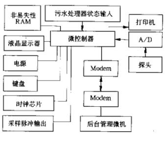 該系統(tǒng)的硬件組成如圖1所示。微控制器采用89C52;探頭選用壓力式探頭,可克服超聲波式探頭易受污水中泡沫干擾的弊病;A/D轉(zhuǎn)換器選用AD1674;時鐘芯片選用DS1302;液晶顯示器為點陣式的MGLS19264,可顯示四行漢字;非易失性RAM選用DS1230;打印機(jī)為普通微型打印機(jī);采樣脈沖輸岀端口用來輸出采樣脈沖,控制采樣器采樣污水;污水處理器狀態(tài)輸入端口可輸入污水處理器的通斷時間,供遠(yuǎn)程監(jiān)控作用