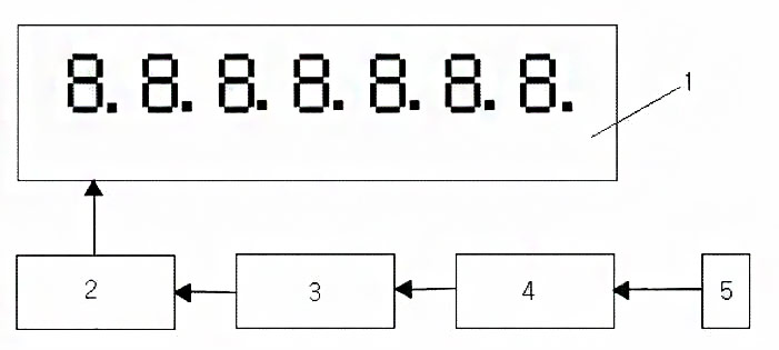 如圖1所示,本實(shí)用新型實(shí)施例所提供的一種用于電磁流量計(jì)的遠(yuǎn)距離流量顯示裝置,包括LED數(shù)碼管1和LED驅(qū)動芯片2,其特征在于:還包括單片機(jī)3、RS485通信芯片4和RS485通信連接件5